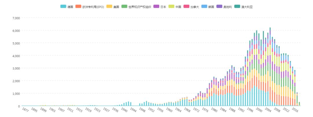 图2的数据显示,巴斯夫在18世纪60年代以前主要是在美国和德国本土申请专利,在1970年开始在日本进行专利申请标志着其亚洲专利申请的开始;20世纪70年代,巴斯夫开始在中国市场崭露头角,其在中国的专利申请始于1985年。从图2中我们还发现在近几年巴斯夫减少了在德国的专利申请,但是其在欧洲专利局的专利申请保持相对稳定的态势。
