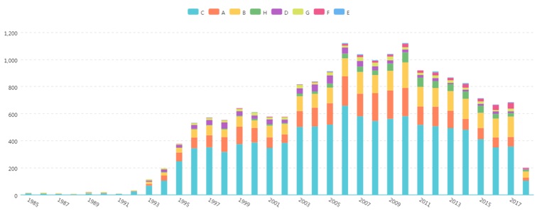图3的数据显示,巴斯夫的专利申请涉及到各个技术领域,主要集中在其主营业务化学材料的这一领域。早期巴斯夫在中国的专利申请相对较少,在1996年巴斯夫在中国的年度申请突破500件。目前,巴斯夫在中国每年保持着稳定的专利申请,体现出巴斯夫重视中国市场。