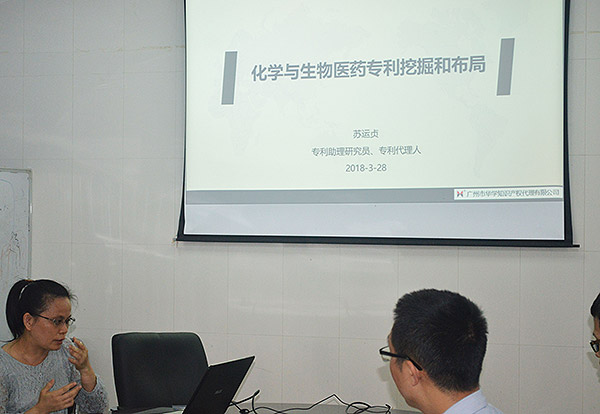 2018年3月28日下午,暨南大学化学与材料学院举办了“化学与生物医药领域专利挖掘与信息检索”培训会,我司专利代理人苏运贞、黄莹受邀参加,出席此次培训会有化学与材料学院副院长、师生等共20余人。