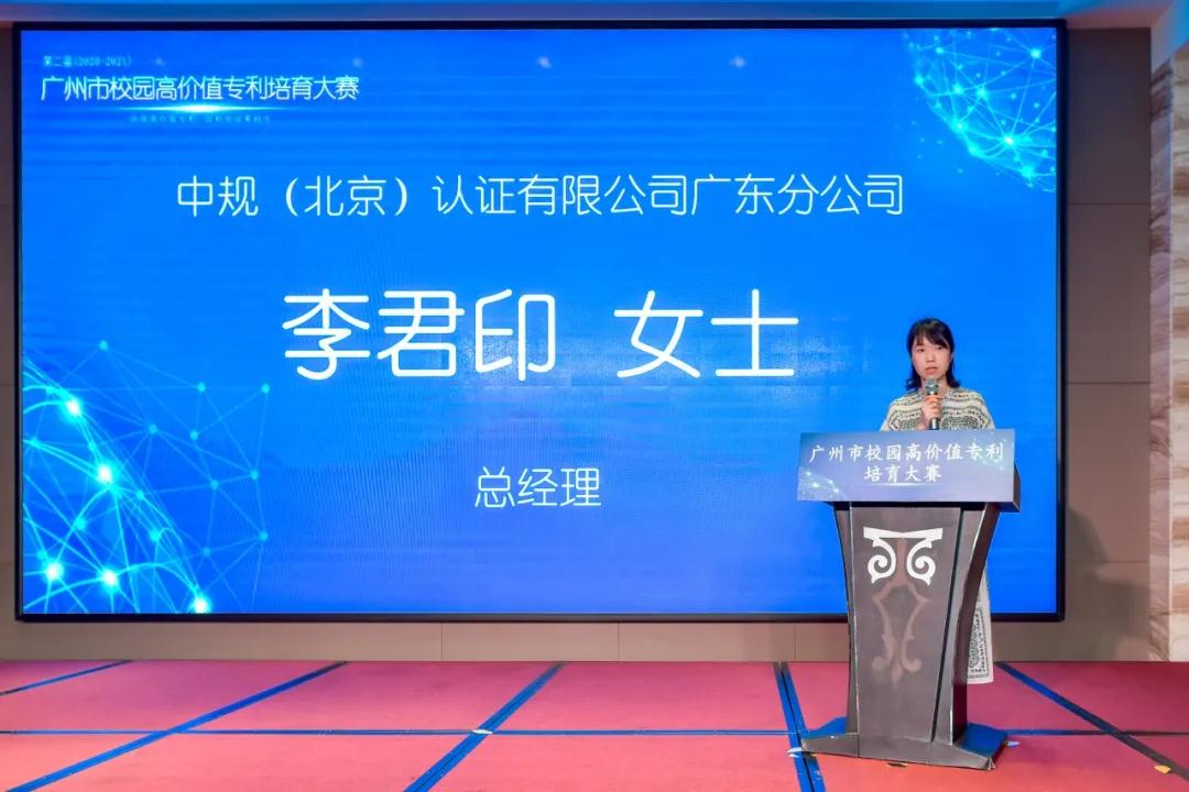 中规(北京)认证有限公司广东分公司总经理李君印代表发言,指出知识产权管理是高校的基础性工作,强化高校知识产权全流程管理,提高科技创新能力,促进科技创新成果的价值实现。通过专利导航、高价值专利培育等提升高校质量创新创造能力的新实践,推动高校科研成果产学研结合,并预祝大赛圆满成功,优秀项目赛出风采。