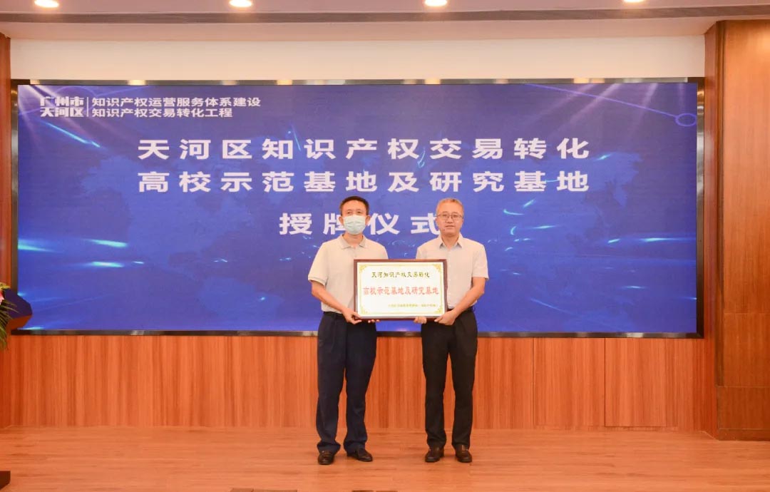 在授牌仪式上,天河区市场监督管理局(知识产权局)一级调研员谈醒将天河区知识产权交易转化高校研究基地牌匾授予华南理工大学科技成果转化办公室主任国家大学科技园总经理江海。