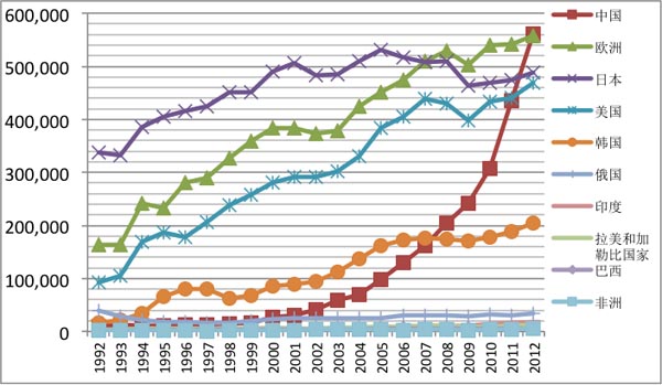 图为发明专利申请数增长情况的国际比较:1992-2012