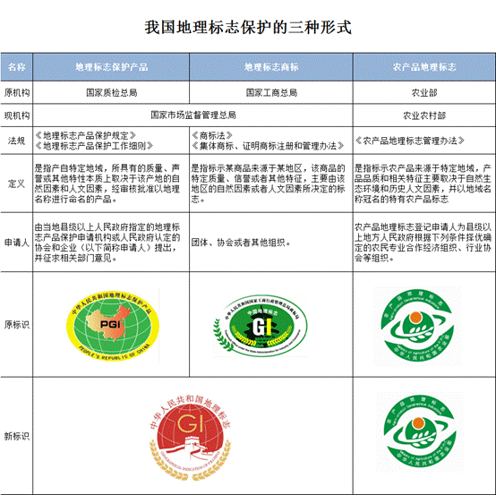我国在实施《深化党和国家机构改革方案》(2018)前,共有三个部门对地理标志进行注册、登记和管理,分别是农业部(现农业农村部)、国家工商行政管理总局(现国家市场监督管理总局、国家质量监督检验检疫总局(现国家市场监督管理总局)。国家质检总局对地理标志产品的申请受理,并对其进行保护和管理、国家工商总局是以证明商标或者集体商标方式实施管理注册、农业部以登记的形式对农产品地理标志进行保护和管理。