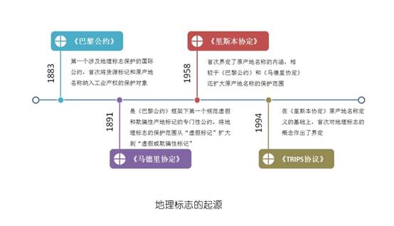 地理标志是知识产权保护的一个重要领域,其概念是在货源标记、原产地名称的基础上发展起来的。地理标志最初以“货源标记”形式出现在1883年缔结的《保护工业"产权巴黎公约》里,经历了从《巴黎公约》、《制止商品产地虚假或斯骗性标记马德里协定》、《保护原产地名称及其国际注册里斯本协定》到 TRIPS协议的演变,从“货源标记”到“原产地名称”再到“地理标志”,代表这一概念在不同的发展阶段有不同的含义,各国也采取了不同的态度和不同的保护模式。
