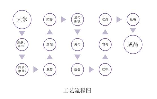 如下图所示,九江双蒸古法酿酒的工艺流程大致为,以大米为原料,辅以黄豆、酒饼叶和曲种制成酒曲, 加上纯净西江水, 采用续添蒸饭、再度发酵、冷却馏酒、斋酒贮存、陈肉酝浸、勾兑沉、过滤包装等方法精心酿造而成。