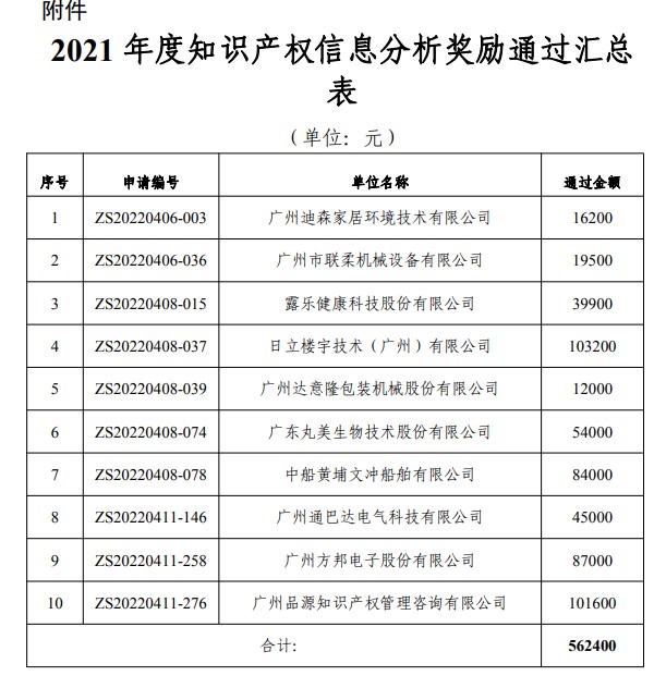 贵单位提交的2021年度知识产权信息分析奖励申请材料收悉。经审核,符合《广州市黄埔区、广州开发区、广州高新区进一步加强知识产权运用和保护促进办法》(穗埔府规〔2020〕12号)第七条、《广州市黄埔区广州开发区广州高新区进一步加强知识产权运用和保护促进办法实施细则》(穗开知规字〔2020〕2号)第六章相关扶持条件,按规定予以发放扶持资金人民币伍拾陆万贰仟肆佰元整(¥562400)。请贵单位收到通知后,于2022年5月10日(星期二)至5月16日(星期一),登陆黄埔兑现通-政策兑现综合服务平台(网址: