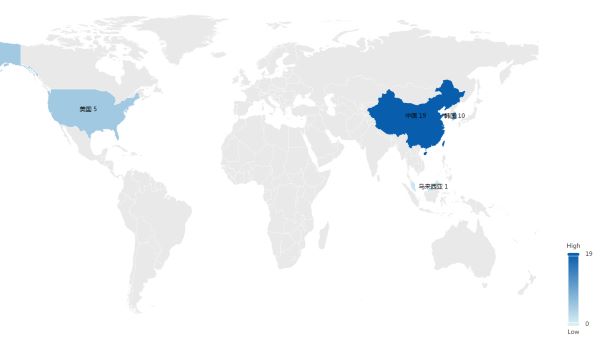 从申请专利申请的地域上看,主要申请的国家有中国(19件)、韩国(10件)、美国(5件)、马来西亚(1件),最早申请专利的是韩国和美国。虽然在申请数量上中国占据优势,但我国申请时间晚于其他国家,因此在后续申请专利时需要注意侵权风险。